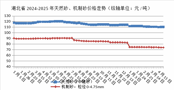 监测数据显示:4月份,天然砂(中粗砂)、机制砂全省均价别离为110.47元/吨、74.15元/吨。具体价钱走势环境如下图:近日,