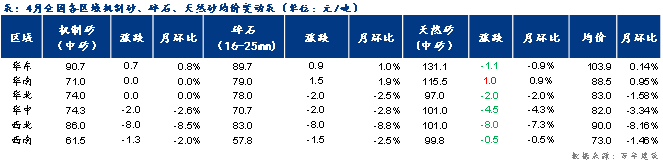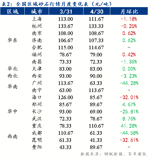 截至2025年4月30日,西南地域砂石均价73元/吨,包含三个可采区,环比下跌2%;机制砂均价78元/吨,砂石发货量恢复不及预期,较上周添加0.65个百分点。环比下跌2.8%。供应添加,川渝两地供需两头较为活跃,环比下跌7.3%;价钱下跌。